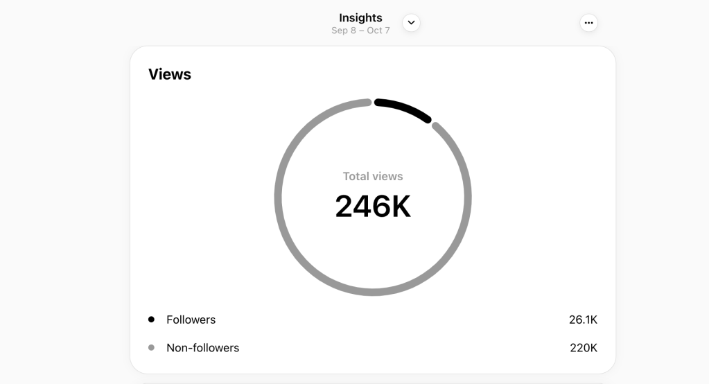 Threads is a platform that came out of left field for me. I can honestly admit that I didn’t use it for quite some time until my gorgeous friend Melrose said she was seeing significant success there. Over the course of a few weeks she was able to get over 10K followers and is still seeing consistent growth there! Most platforms it is difficult to reach non-followers, on Threads though most of your reach seems to be non-followers, as evidenced by the below screenshot of my current insights.